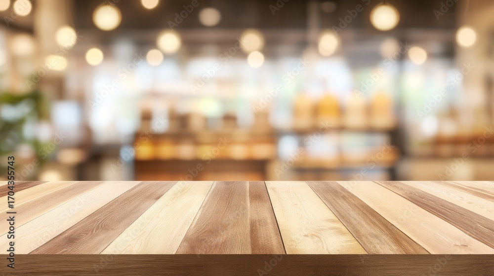 Naklejka Jedzenie - Empty wooden table with blurred cafe background #1704355743