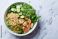 • Balanced quinoa, arugula, chicken, cucumber and pea lunch bowl.