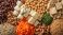 • Assorted dried foods and legumes, including beans, nuts, tofu, and shredded vegetables, arranged in a colorful display.