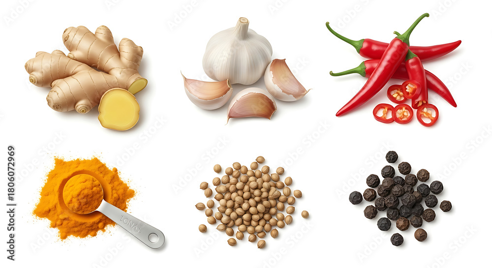 • Culinary spices ginger garlic chili peppers turmeric coriander pepper
