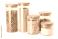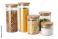 • Glass storage jars with wooden lids filled with various dry food ingredients