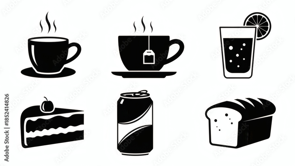 • Monochrome vector icons of everyday food and beverage essentials coffee, tea, soda, cake, bread. Ideal for menus and cafe designs