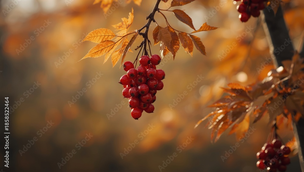 Naklejka Jedzenie - Rowan berries against a woodland scene, natural food sources for birds #1858522464