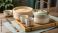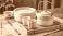 • A traditional chinese tea set with a ceramic teapot and bamboo steamer basket on a wooden table