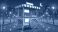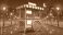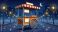 • Mobile food stall stands empty on a wet city pavement beneath a night sky with a crescent moon