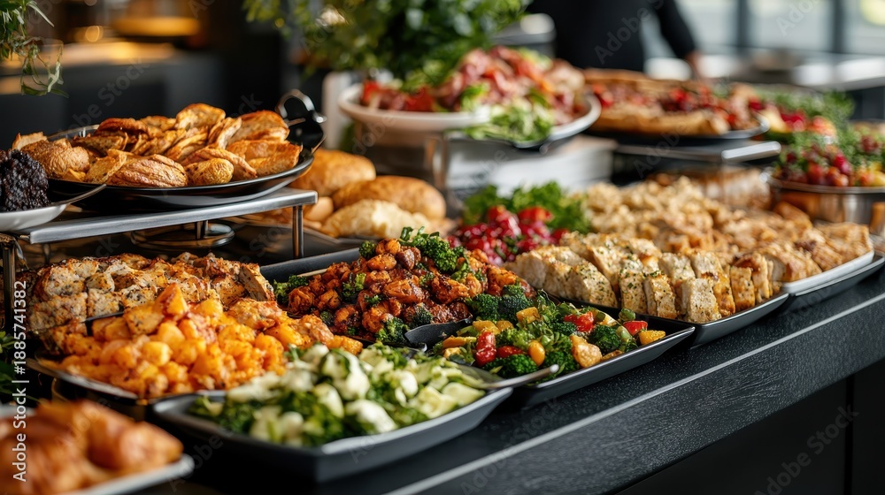 Naklejka Jedzenie - A beautifully arranged buffet table showcases an assortment of vibrant dishes including salads,... #1885741382