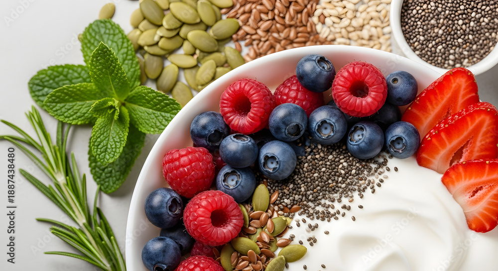 • A vibrant close-up overhead shot showcasing a delicious and healthy nutrition-rich food bowl filled with fresh berries, seeds, and yogurt, promoting wellness and good health