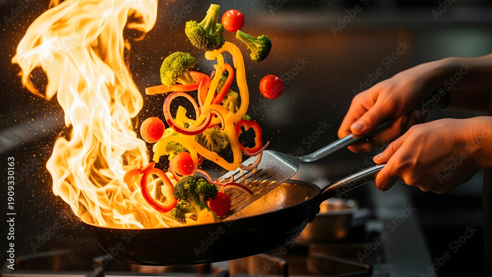 Naklejka Jedzenie - Chef's fiery cooking, fresh food #1909330163