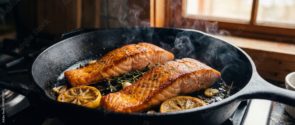 • Pan-Seared Salmon Fillets Sizzling in a Cast Iron Skillet with Fresh Lemon Slices, Aromatic Herbs, and Garlic; Cinematic Widescreen Panorama of Gourmet Seafood Dinner Preparation with Rising Steam