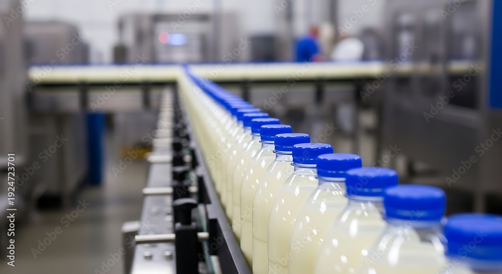 Naklejka Jedzenie - Milk Bottles with Blue Caps Moving on a Conveyor Belt in a Modern Dairy Food Processing Plant #1924723701