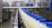 • Milk Bottles with Blue Caps Moving on a Conveyor Belt in a Modern Dairy Food Processing Plant