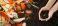Naklejka Jedzenie - Organic waste for composting on soil and woman holding green seedling, top view. Natural fertilizer #416889138