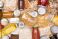 • Food donations such as pasta, rice, oil, peanut butter, canned food, jam and other on white wooden table , top view