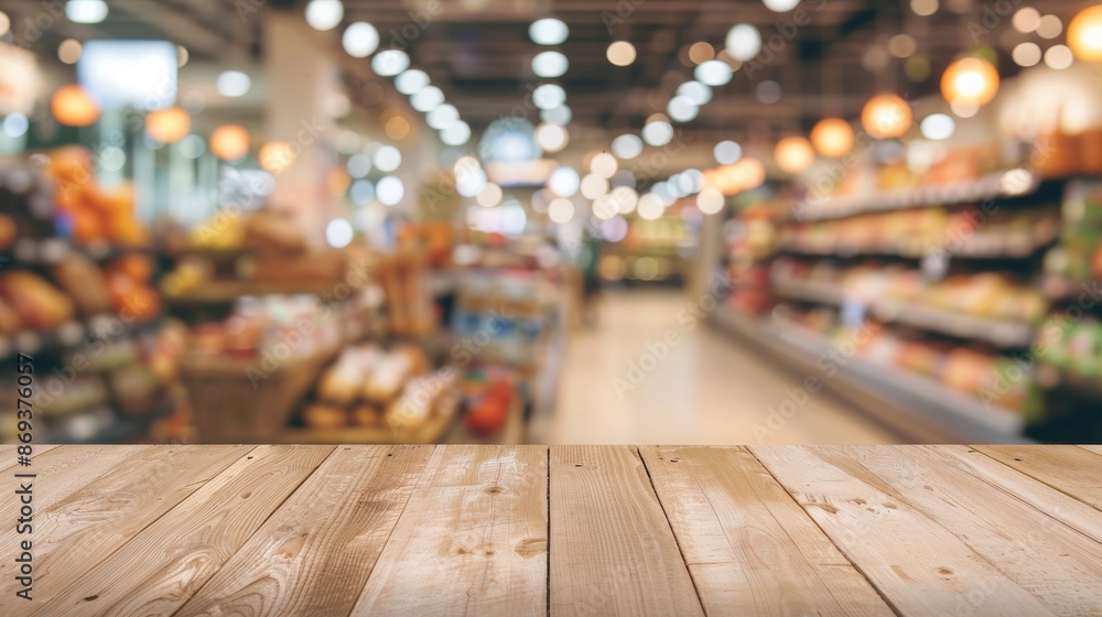 Naklejka Jedzenie - Empty wooden table top for product display, presentation stage. Blurred supermarket with products... #869376057