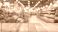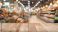 • Empty wooden table top for product display, presentation stage. Blurred supermarket with products on shelves in the background.