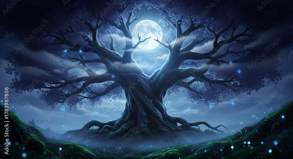 Naklejka Kosmos - big tree at night with a bright moon #1783987808