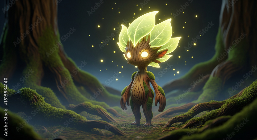 • fantasy creatures resembling tree spirits or "sprites" in a dimly lit forest environment.