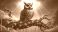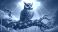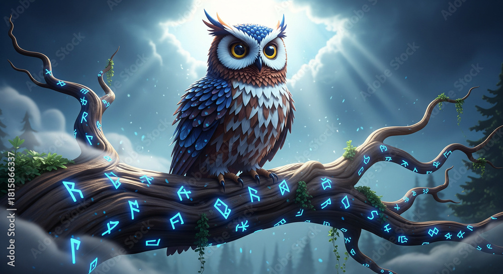 • fantasy illustration of a brown and blue owl with large yellow eyes, perched on a gnarled tree branch.