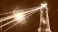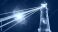 • Lighthouse emitting light beams against a dark cosmic sky background