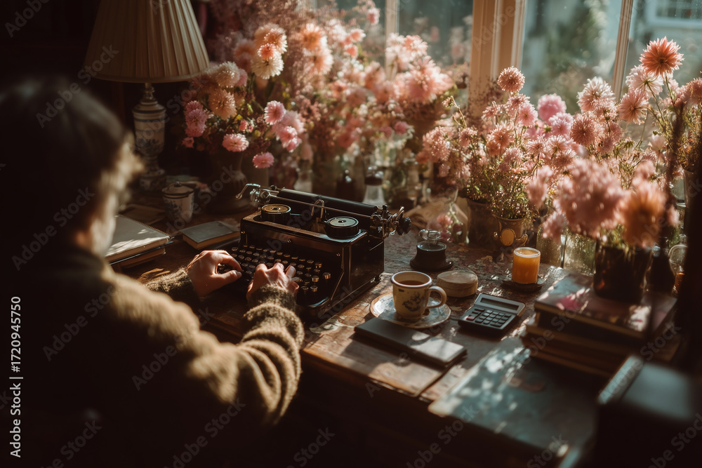 Naklejka Muzyka - Rzut z góry na ręce podczas pracy przy laptopie – klimatyczne biurko z kwiatami #1720945750
