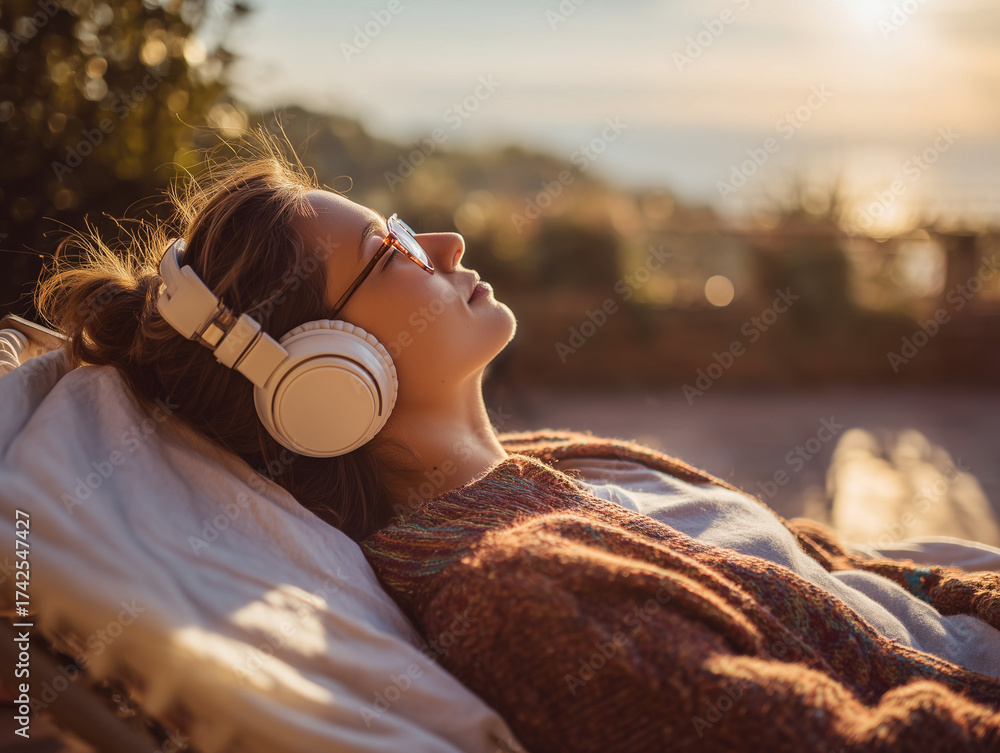 Naklejka Muzyka - Kobieta w słuchawkach - relaks #1742547427