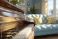 Naklejka Muzyka - Detale brązowego pianina w ciepłym słońcu na pierwszym planie, z błękitną sofą, żółtymi... #1776708169