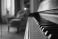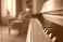 • Detal brązowego, drewnianego pianina w salonie. Klawiatura na pierwszym planie, a w tle rozmyty fotel i przytulne, nastrojowe oświetlenie świec.