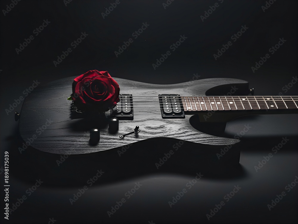 • Czarna gitara elektryczna z czerwoną różą leżącą na korpusie, symbolizująca połączenie pasji, mroku i romantyzmu w jednym kadrze, róża, rose, czerwona