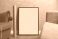 • Ramka na plakat stoi oparta o betonową ścianę na drewnianej podłodze w salonie, obok niej stoi czerwony fotel, leżą także słuchawki.