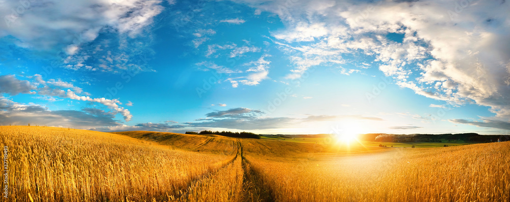 Naklejka Panorama - Beautiful natural landscape panorama of golden wheat field at sunset against background of... #377119493