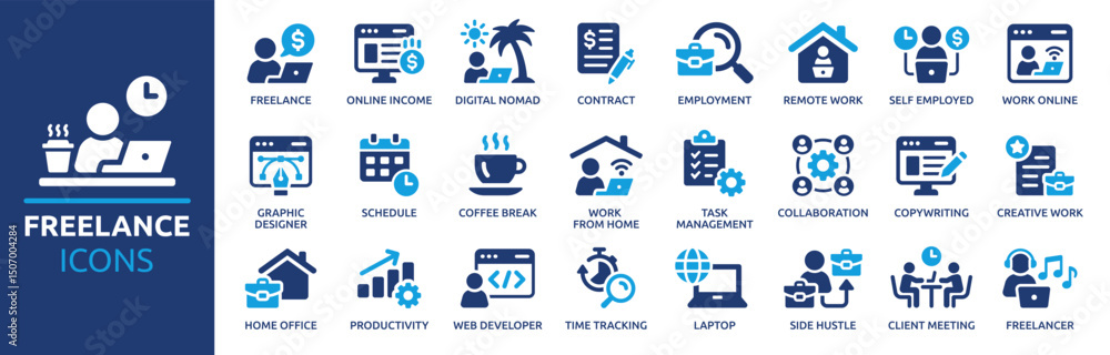 • Freelance icon set. Containing work online, remote work, freelancer, laptop, home office, client meeting, self-employed, graphic designer and more. Solid vector icons collection.
