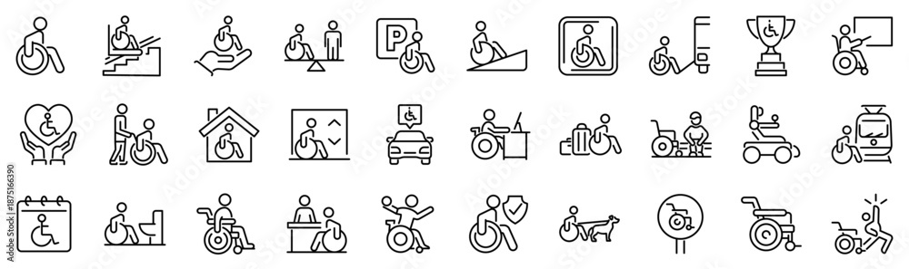 • Set of 30 outline icons related to wheelchair. Linear icon collection. Editable stroke. Vector illustration