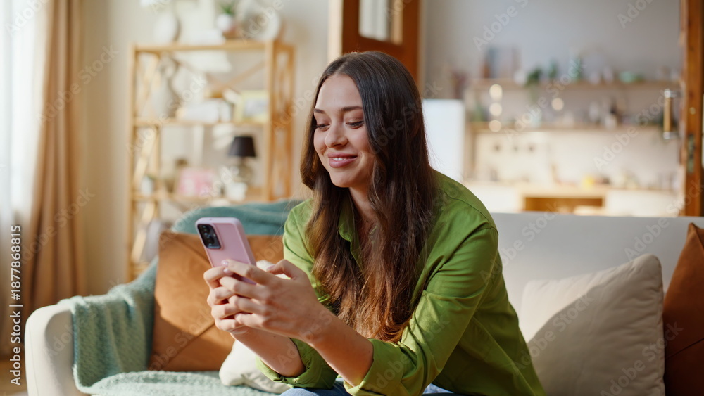 Naklejka Fantasy - Satisfied woman shopping online using mobile phone app sitting sofa closeup #1877868815