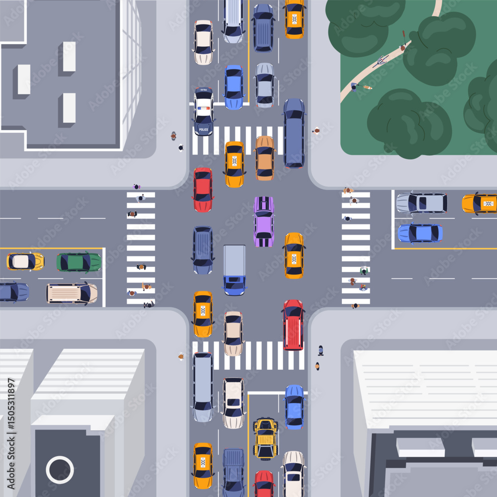 • City intersection, top view. Busy crossroad with cars, auto transport, vehicles, trucks, taxi and pedestrians, crossing crosswalks from above, overhead. Urban traffic flow. Flat vector illustration.