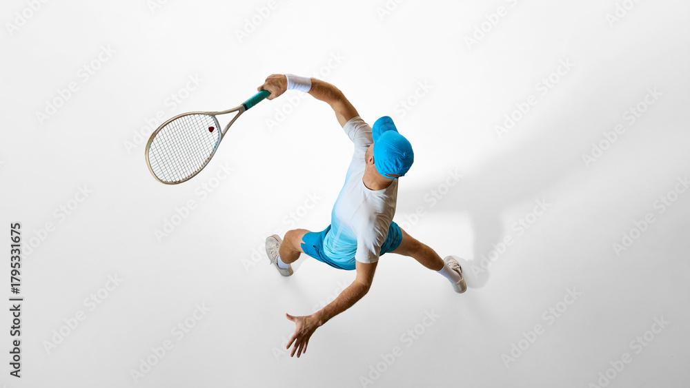 • Tennis player in bright blue uniform preparing serve captured from above on white studio floor. Concept of digital design, creative layout, sport aesthetics, and composition reference.