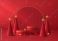 • Red 3D cylindrical podium merry Christmas background with Christmas tree, Glow glitter scene. Minimalist platforms mockup pedestal design. Abstract stands product display presentation. Stage showcase.