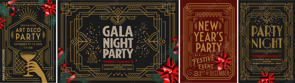 • Elegant Art Deco party posters with gold geometric frame, festive confetti. Luxurious vintage design for gala invitation, New Year event, holiday party, and glamorous celebration