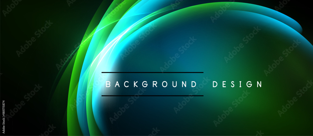 • Abstract flowing lines create vibrant blue, green gradients. Text reads background design centered within luminous shape. Dark background provides contrast.