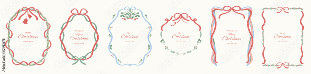 • Christmas and New Year decorative frames vector illustration with mistletoe ribbons red curves and minimal festive borders — clean design for greeting cards and holiday stationery