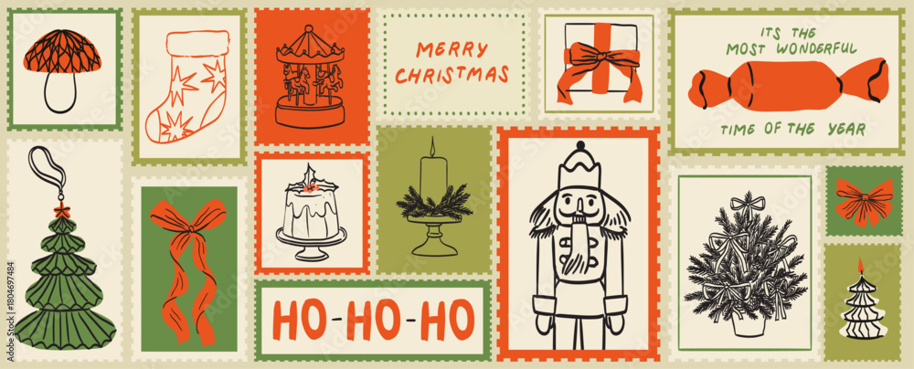 Naklejka Folklor - Winter holidays hand drawn post stamps in doodle sketch style. Christmas or new year postal... #1804697484
