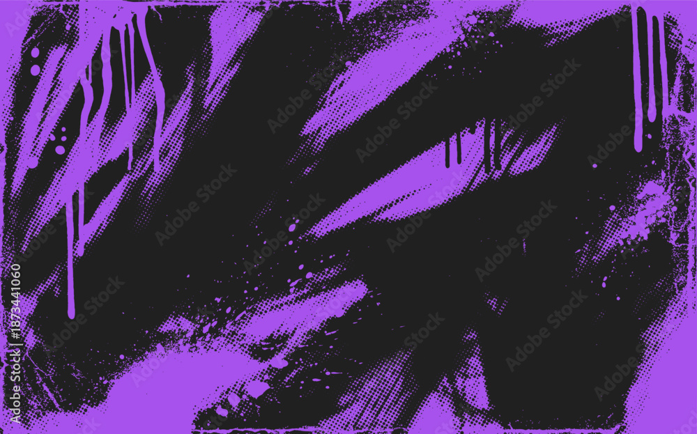 • Grunge punk urban background in purple black colors with paint splatters and drips. Grunge punk y2k halftone background with hand drawn bold brush strokes. Scratches effect, purple spray paint.
