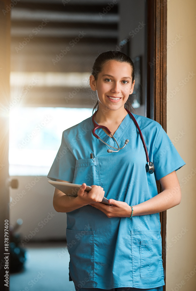 • Portrait, nurse and happy woman with tablet in clinic for research, telehealth and healthcare. Face, medical surgeon and digital technology for hospital service, results and online report in Spain
