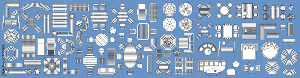 • Top view of collection of outdoor and garden furniture in top view. Set includes different types of patio tables, chairs, benches, loungers, umbrellas and seating arrangements.
