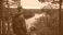 • Hunter with a dog standing on a cliff overlooking a forest lake in Sweden.