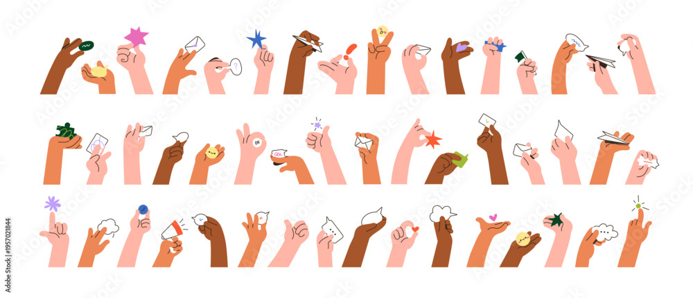 • Hands holding heart, speech bubble, star, emoji, message. Giving feedback, sharing opinion, emotion. Communication arm gestures, signs. Flat vector illustrations set isolated on white background