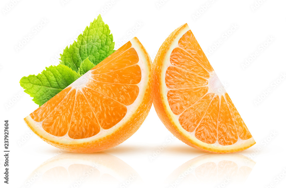 Naklejka Owoce - Isolated orange slices. Two pieces of orange fruit with mint leaf isolated on white background... #237927604