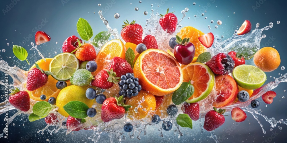 • Colorful fruits exploding in mid-air with water splashes, fruits, explosion, splash, water, colorful, vibrant, fresh, juice