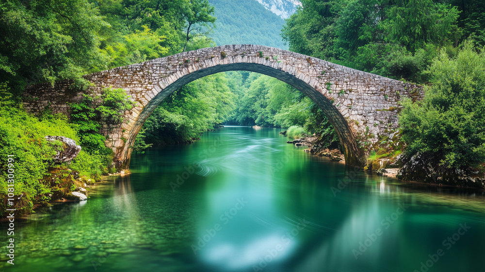 Naklejka Mosty - Kamienny most o zabytkowym charakterze unosi się nad rzeką, której wody odbijają zieleń... #1081300991