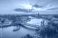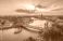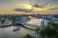• Widok z lotu ptaka na mosty, statek na rzece oraz zachodzące słońce - Wrocław, Polska