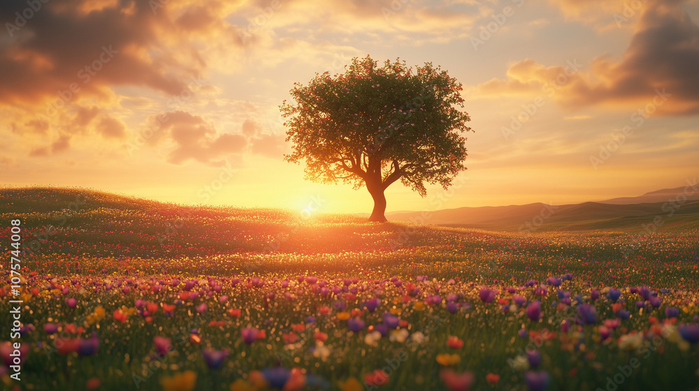 Naklejka Kwiaty - Samotne drzewo w otoczeniu dzikich kwiatów, oświetlone miękkim światłem zachodzącego słońca. #1075744008